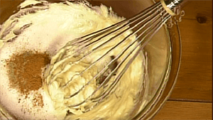 4. 3にグラニュー糖、塩、シナモンパウダー、ナツメグパウダー、カルダモンパウダー、アーモンドパウダーを入れ、泡立て器で白っぽくなるまで混ぜ合わせる。