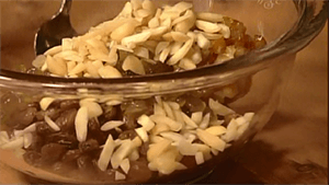 6. ボウルにラム酒漬けのサルタナレーズン、レモンピール、オレンジピール、一晩水に漬けたアーモンドを入れ混ぜ合わせておく。
