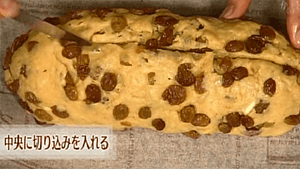 9. 麺棒を使って生地を長方形に伸ばしたら、手で巻いて縦長のだ円形に成形する。オーブン用の紙を敷いた天板に生地を置き、生地の中央にナイフで切り込みを入れる(深く入れすぎないように注意)。生地の表面に出ているレーズンを指で取り除く。
