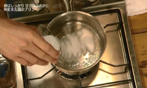 鍋を火にかけ、グラニュー糖を少しずつ加えて溶かす。