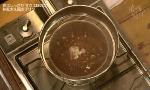 鍋に粉ふるいでふたをしてから水を注ぐと、カラメルが沸いて飛び散るのを防げる。