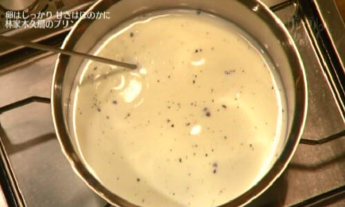 鍋に牛乳を入れ、バニラのさやとバニラビーンズを加え、火にかけて温める(約50℃)。