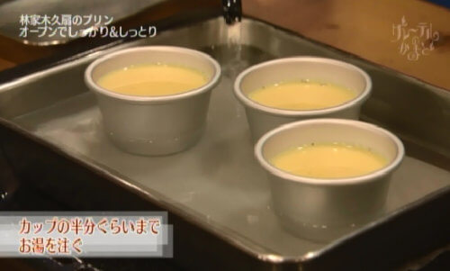 バットにペーパータオルを敷き、プリンカップを並べ、お湯を型の半分くらいまで注ぐ。160℃のオーブンで35分間蒸し焼きにする。