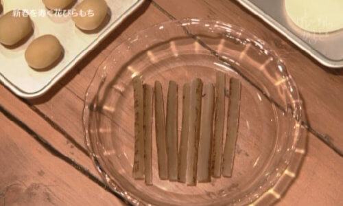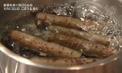 ごぼうを水で洗い、約10cmの長さに切る。途中さし水をしながら約2時間、簡単に竹串が刺さる程度にゆでる。