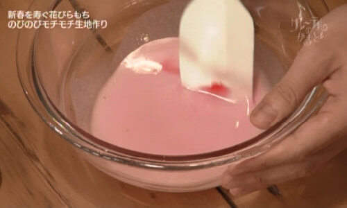 出来上がった【生地】の1/3を色素で薄赤色に染める。