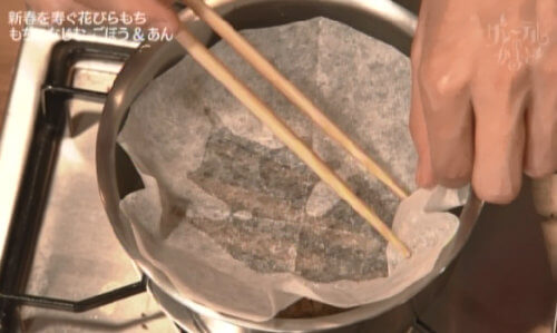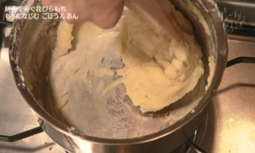 白こしあんに分量の水を加えて中火にかけ、炊きなおす。あんを少しへらに取り、さわってみて手につかなくなるまで炊く。