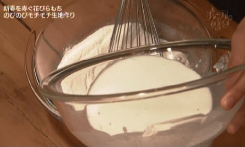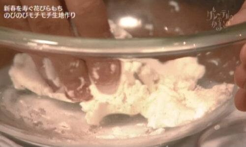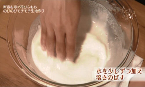白玉粉に分量の水の一部を加える。耳たぶぐらいのかたさになるまで練り、指先でダマを完全につぶす。