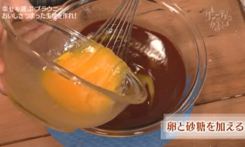 卵を泡だて器でほぐし、砂糖を加えて混ぜる。