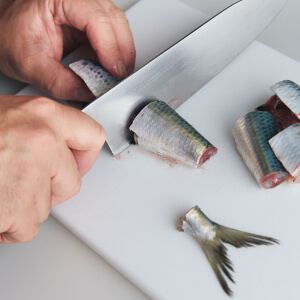いわしは包丁の根元の部分を使い、力を入れて骨ごと切る。