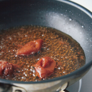 ボウルに【B】を入れ、梅干しを半分にちぎって種ごと加え、混ぜ合わせてたれをつくる。フライパンをきれいにし、たれを入れて中火で煮立て、梅干しが煮くずれてきたら、2のいわしにかける。