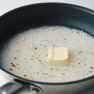 1の米をざるに上げて水けをよくきり、フライパン(直径20cm)に入れる。【A】を加えて混ぜ、平らにする。バター10gをのせて黒こしょう少々をふる。
