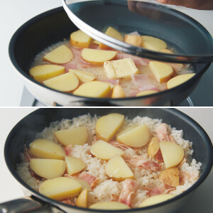 ベーコンと新じゃがいもをそれぞれ重ならないように並べ、ふたをして(写真上)中火にかける。煮立ったらごく弱火にして10分間炊き、最後に10秒間ほど強火にする。火を止めてふたをしたまま7~8分間蒸らす。ふたを取り(写真下)、サックリと混ぜる。