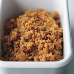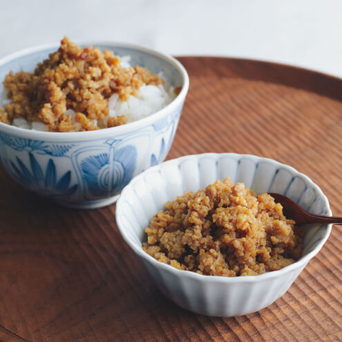 ピリッとスパイシーなそぼろは、ご飯をおかわりしたくなるおいしさ。味つけを変えてアレンジを楽しんでも。