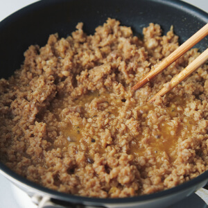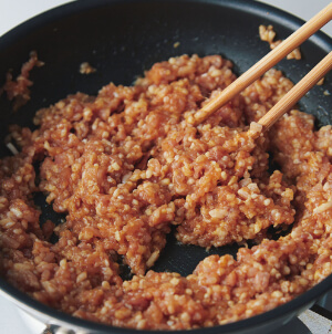 加熱する前にひき肉に調味料を混ぜておくと、パラパラになりやすい。味もよくしみてしっとりと仕上がる。