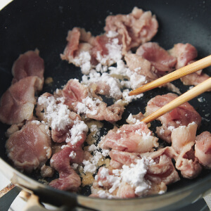 豚肉に片栗粉をまぶすと味がからみやすくなる。