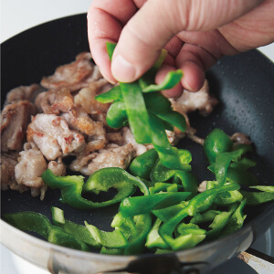 肉の色が変わったら、ピーマンを加えてさらに炒める。