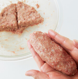 【肉ダネ】をよく練り混ぜ、粘りが出たら4等分にし、手に水をつけて細長く形を整える。