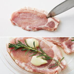 豚肉は脂身と赤身の間4~5か所に切り込みを入れて筋を切り(写真上)、塩小さじ1/3、こしょう少々をふる。にんにくは縦半分に切り、芯を除いてつぶす。豚肉にローズマリーとにんにくをのせ、オリーブ油大さじ2+1/2を加えてからめ、20分間以上おいて下味をつける(写真下/一晩おくとよりおいしくなる)。