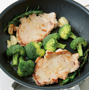 焼き色がついたら豚肉を返し、あいているところにブロッコリーを加え、一緒に3~4分間焼く。途中、ブロッコリーとにんにくは時々返し、焼けたら取り出す。