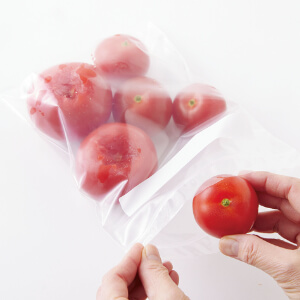 2種類のトマトは洗って水けを拭き、ヘタを除く。冷凍用保存袋に入れ、できるだけ空気を抜いて口を閉じ、冷凍庫に入れる。