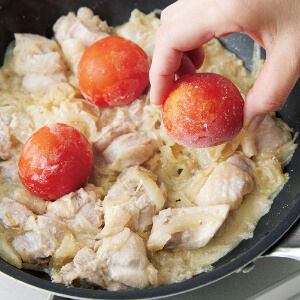 鶏肉は【A】を順にからめて約10分間おく。たまねぎは縦半分に切り、縦に薄切りにする。にんにくは横に薄切りにする。フライパンに油大さじ1、にんにく、たまねぎを入れて中火にかけ、5~6分間炒める。鶏肉をつけ汁ごと加え、混ぜながら1~2分間炒め、冷凍ミディトマトを凍ったまま加える。