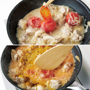 弱めの中火にし、時々混ぜながら煮る。トマトの皮がむけてきたら、菜箸でつまんで除く(写真上)。カレー粉、塩小さじ1を加えて中火にし、木べらでトマトをつぶしながら5~6分間煮る(写真下)。器に盛ったご飯にかけ、あればきゅうりのピクルスを添える。
