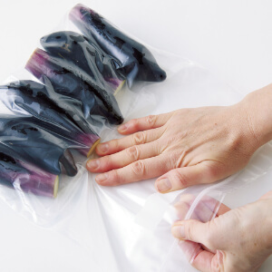 なす6コは洗って水けを拭き、ヘタを切り落とす。冷凍用保存袋に入れ、できるだけ空気を抜いて口を閉じ、冷凍庫に入れる。