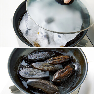 煮立ったら落としぶたをし、さらにふたをして約10分間煮る(写真上)。ふたを外して弱めの中火にし、時々返しながら落としぶたをして約30分間、煮汁が少なくなるまで煮る(写真下)。青じそは縦半分に切り、横に1.5cm幅に切る。器になすを盛り、青じそを添える。