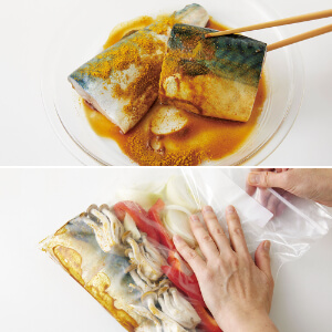 さばはペーパータオルで水けを拭き、しょうゆとカレー粉をからめる(写真上)。しめじは根元を切り落とし、小房に分ける。パプリカはヘタと種を除き、縦に1.5cm幅に切る。たまねぎは縦に1cm幅に切る。冷凍用保存袋にさば、野菜の順に入れ、空気を抜いて口を閉じ(写真下)、冷凍庫に入れる。