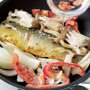 凍ったままのさばと野菜を酒蒸しするように加熱すると、風味がよくなり、くせも出にくい。