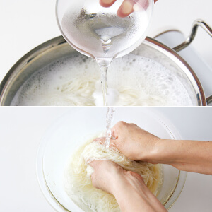 鍋にたっぷりの湯を沸かしてそうめんを入れ、中火にして軽く混ぜる。煮立ったら水カップ1/2を加え(差し水/写真上)、再び煮立ったら約10秒間ゆでて火を止める。冷水にとり、流水の下でもみ洗いし(写真下)、ざるに上げて水けをきる。