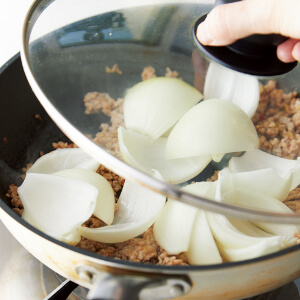 大きめに切ったたまねぎは、炒めただけでは火が通らないので、ふたをして蒸し煮にする。