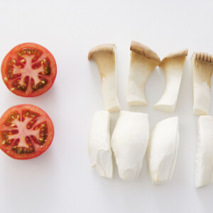 トマトはヘタを除き、横半分に切る。エリンギは縦4等分に切り、長さを半分に切る。
