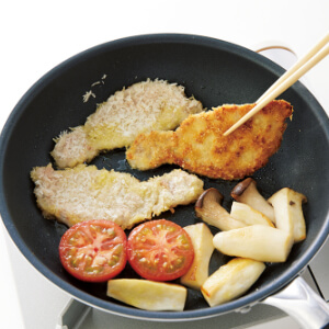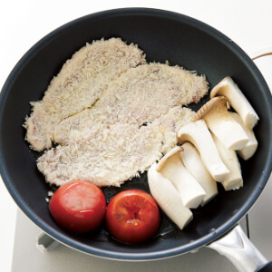 豚肉を返し、さらに約3分間焼く。トマトとエリンギは焼けたら取り出し、混ぜ合わせた【C】をからめる。器にカツレツを盛り、トマトとエリンギはちぎったサニーレタスとともに添える。