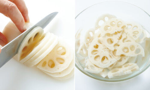 れんこんは縦半分に切り、3~4mm厚さに切る(写真左)。水に入れて約2分間さらし(写真右)、ざるに上げてペーパータオルで水けを拭く。