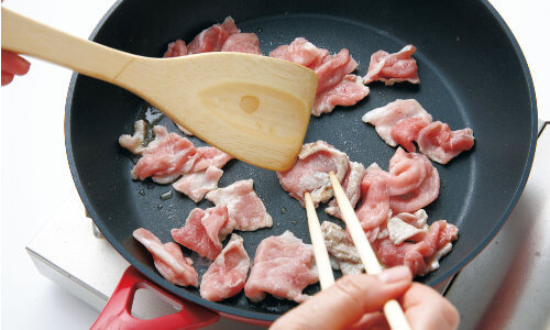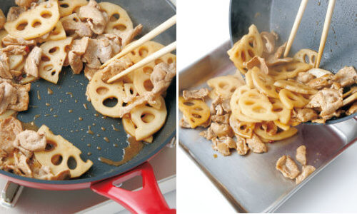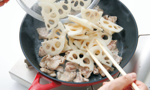 4. 肉の色が変わったら、れんこんを加えて、よく炒める。れんこんが透き通ってきたら、赤とうがらしを加えてサッと炒める。
