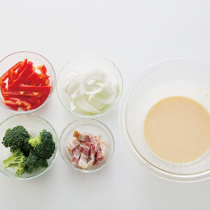 たまねぎは縦に薄切りにし、ベーコンは1cm幅に切る。大きめのボウルに【A】の卵を溶きほぐし、残りの材料を加えて混ぜておく。ブロッコリーは小房に分け、大きければ縦2~4等分に切る。パプリカはヘタと種を除いて縦半分に切り、横に7〜8mm幅に切る。