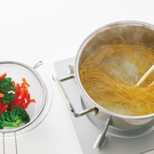 パスタの前にサラダの野菜をゆでれば、2品がスイスイでき上がり。