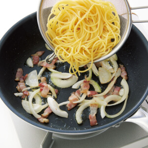 フライパンにオリーブ油大さじ1を中火で熱し、ベーコンとたまねぎを加えて2~3分間炒める。ゆでたスパゲッティを加え、大きく4~5回混ぜて火を止める。