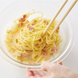 パスタの余熱で卵に火を通す。しっかり混ぜると卵液がパスタになじんでおいしくなる。