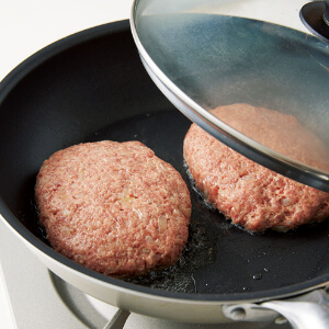 ハンバーグは厚みがあるので火が通りにくい。ふたをして熱を閉じ込めてじっくり焼く。