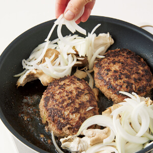 【肉ダネ】を返し、フライパンの端にまいたけ、たまねぎを加え、再びふたをして弱火で8~9分間焼く。まいたけとたまねぎは時々混ぜ、しんなりしたら塩・こしょう各少々をふって取り出す。ハンバーグが焼けたら火を止めて取り出し、フライパンに【A】を加えて余熱でバターを溶かす(ソース)。器にハンバーグを盛り、ソースをかけてパセリをふり、まいたけとたまねぎを添える。