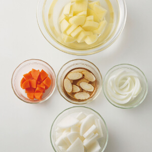 じゃがいもは1cm厚さのいちょう切りにし、水に約1分間さらして水けをきる。ごぼうはたわしでこすってよく洗い、斜め薄切りにし、水に約1分間さらして水けをきる。たまねぎは縦に5mm幅に切る。大根とにんじんは7~8mm厚さのいちょう切りにする。