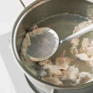 アクを除くと味がすっきりする。最初に煮立ったときにアクがたくさん出るので、しっかり除くとよい。