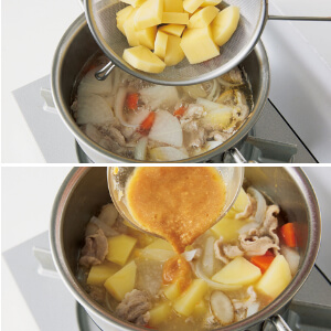 じゃがいもを加え、さらに5~6分間煮る。みそ大さじ2を煮汁少々で溶いて加え、全体を混ぜて火を止める。器に盛り、好みで七味とうがらしをふる。