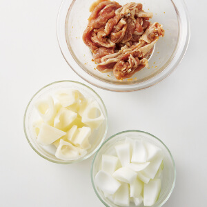 れんこんは縦4等分に切り、小さめの一口大の乱切りにする。酢水(水カップ1に酢大さじ1/2)に約2分間さらし、水けを拭く。たまねぎは横半分に切り、縦1.5cm幅に切る。豚肉に【A】を順に加えて混ぜる。【B】、【水溶き片栗粉】はそれぞれ混ぜておく。