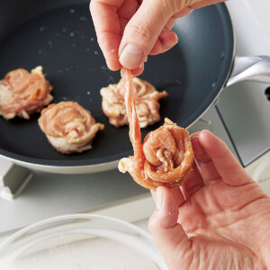 フライパンに油大さじ1を中火で熱し、いったん火を止める。1の豚肉を1枚ずつクルクルと巻いて形を整え、フライパンにのせる。弱めの中火にかけ、途中で返しながら2~3分間表面を焼いて取り出す。