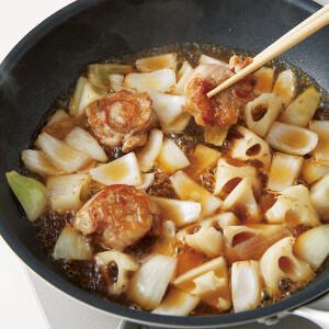 2のフライパンにれんこんを加えて5~6分間炒め、たまねぎを加えてさらに約2分間炒める。混ぜておいた【B】を加え、煮立ったら2の豚肉を戻し入れる。中火で混ぜながら煮立て、【水溶き片栗粉】をもう一度混ぜて加え、全体を混ぜてとろみをつける。ごま油小さじ1を加えて香りをつける。