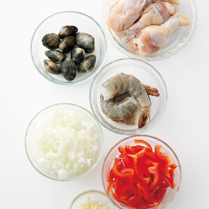 えびは背ワタがあれば竹串で除き、足を除く。水でよく洗い、ペーパータオルで水けを拭く。手羽元はペーパータオルで水けを拭く。あさりは殻をこすり合わせて洗い、水けをきる。パプリカはヘタと種を取り除き、縦半分に切ってから横に細切りにする。たまねぎ、にんにくはそれぞれみじん切りにする。