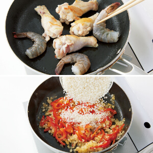 フライパンにオリーブ油大さじ1/2を中火で熱して手羽元を並べ入れ、時々転がしながら約2分間焼く。えびを加え、時々返しながらさらに約1分30秒間焼く。火を止め、取り出す。オリーブ油大さじ1を足して弱めの中火にかけ、にんにく、たまねぎ、パプリカを加えて約2分間炒め、米を洗わずに加え、さらに2~3分間炒める。